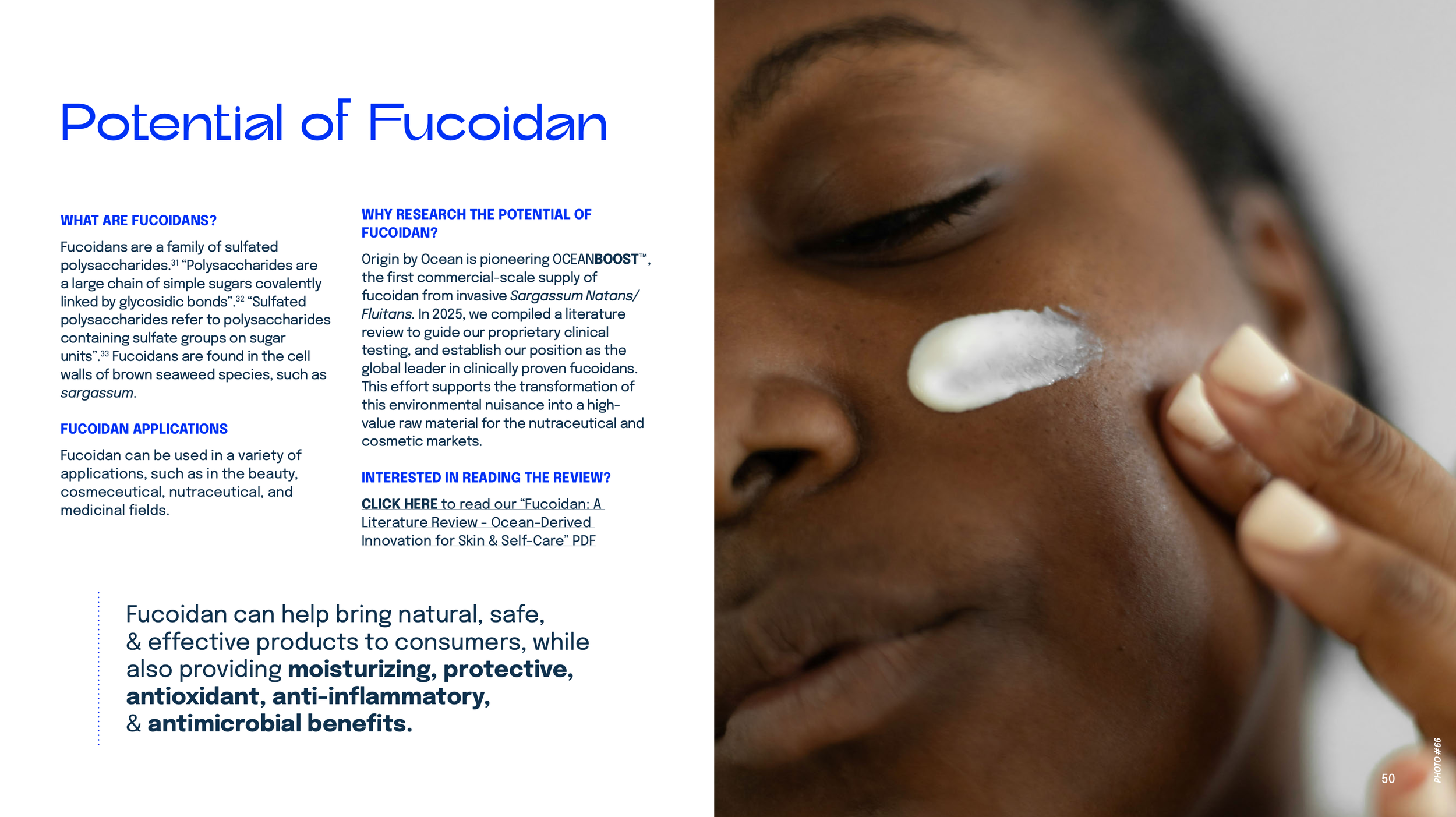 I created a 19-page brochure about fucoidan, covering information about Origin by Ocean, market trends and research, fucoidan, and fucoidan’s benefits (moisturization, skin protection, antioxidant activity, anti-inflammation, and antimicrobial properties).